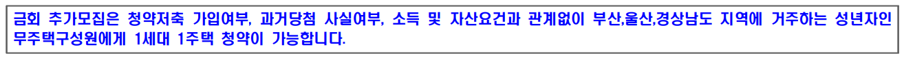 * 금회 추가모집은 청약저축 가입여부, 과거당첨 사실여부, 소득 및 자산요건과 관계없이 부산,울산,경상남도 지역에 거주하는 성년자인 무주택구성원에게 1세대 1주택 청약이 가능합니다.