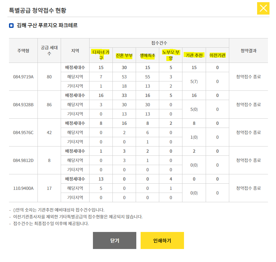어제 있었던 김해 구산동 푸리지오 특공 경쟁률 입니다.
