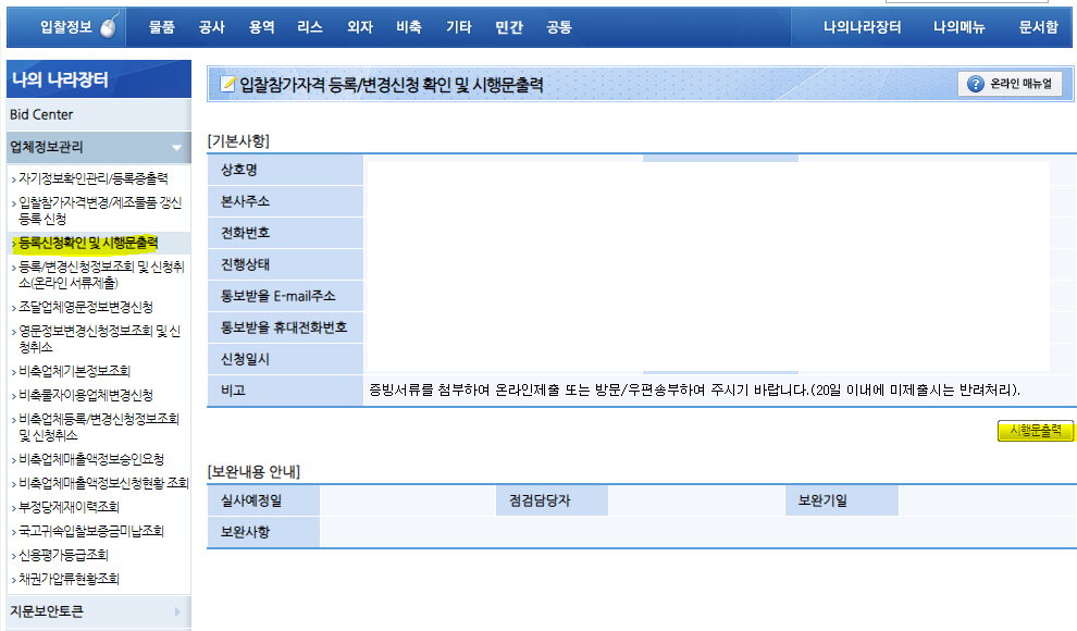 [업체정보관리] 에서 [입찰참가 자격변경/제조물품 갱신등록 신청]으로 들어가시면 됩니다.
