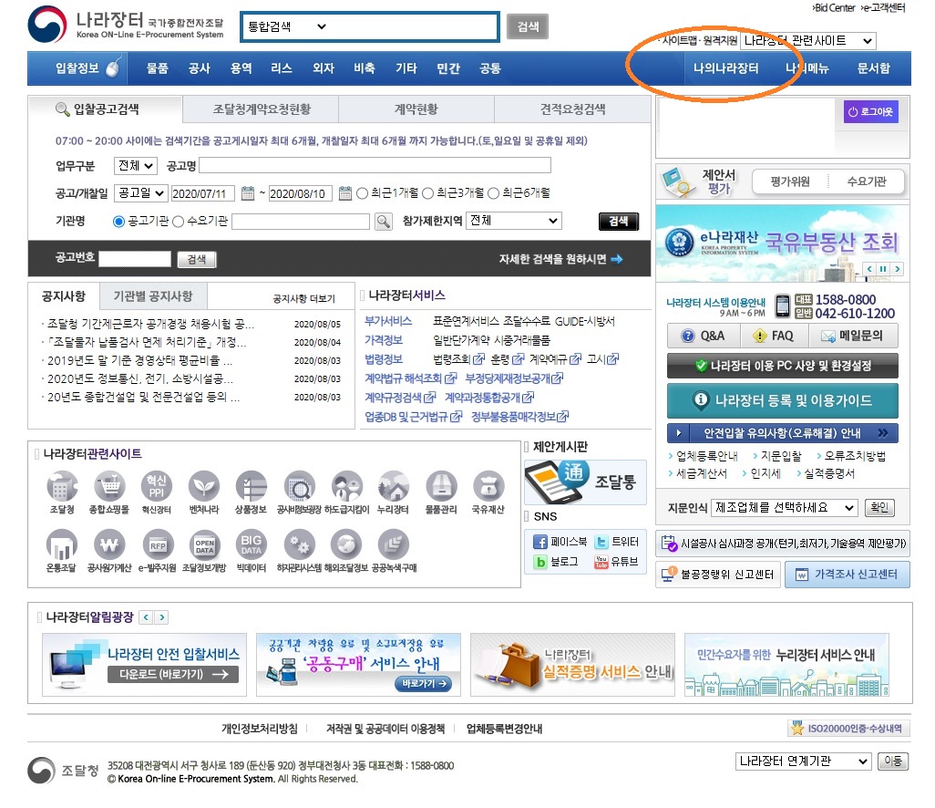 오른쪽 위에 [나의나라장터] 라는 메뉴를 클릭합니다.