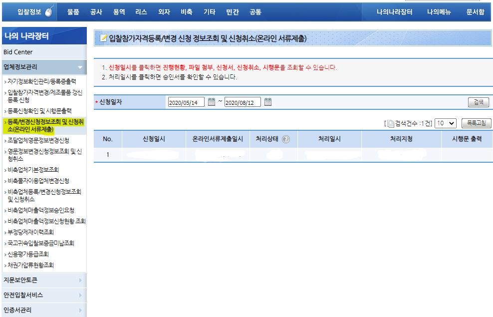 [등록/변경신청정보조회 및 신청취고(온라인 서류제출)] 로 들어가셔서