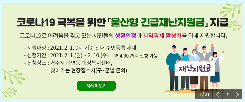 울산광역시에서는 코로나19로 인해 어려움을 겪고 있는 시민들의 생활안정을 위해 긴급재난지원금을 지원합니다. 긴급재난지원금 신청 지원대상 2021. 2. 1. 0시 기준 관내 주민등록을 두고 있는