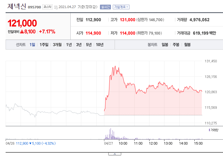 제넥신이 자사가 연구개발(R&D)하고 있는 코로나19 백신을 수출한다는 소식에 급등세를 기록하고 있다. 27일 오전 9시 27분 현재, 제넥신은 전 거래일 대비 1만 3,800원(12.22%) 오른 12만 6,700원에 거래