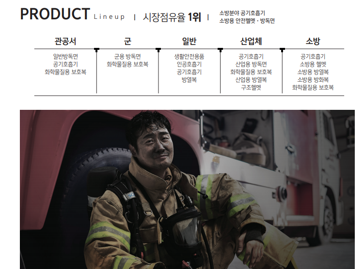 공기호흡기, 방독면, 피복류, 보건용 마스크 등을 제조하고 있는 기업입니다.