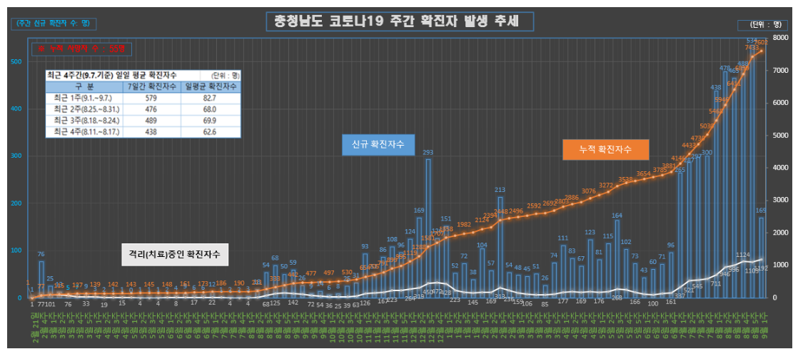 신종 코로나바이러스 감염증 발생동향 모바일 환경에서는 좌우로 이동하여 내용(표)을 보실 수 있습니다. ※ 자료원 : 질병보건통합관리시스템 / 2021.9.8. 00:00 기준, (단위:명) 도내 신종 코로나바