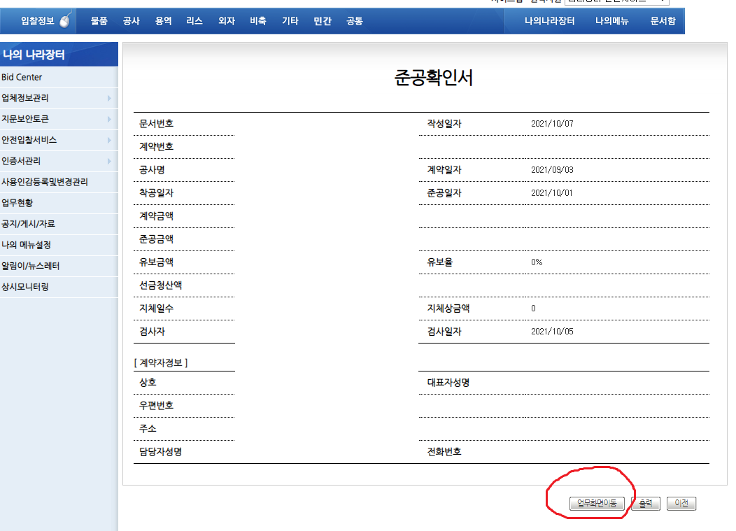 3.준공확인서 화면에서 [업무화면이동] 으로 들어가세요