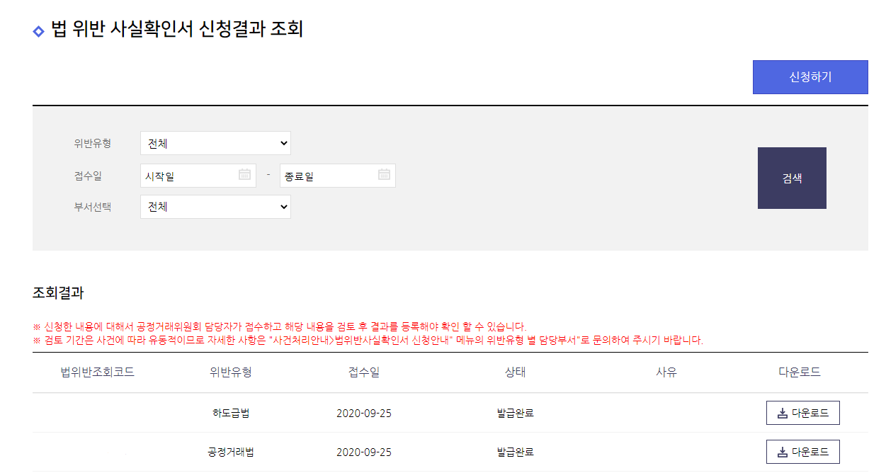 [업무] 기업 또는 법인 법위반 사실확인서 쉽게~ 발급 받기(공정거래법 하도급법 표시광고법 입찰담합 )