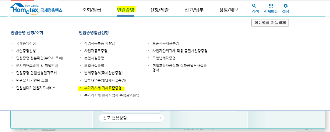 메뉴> 민원증명 > 부가가치세 과세표준증명으로 들어간다.