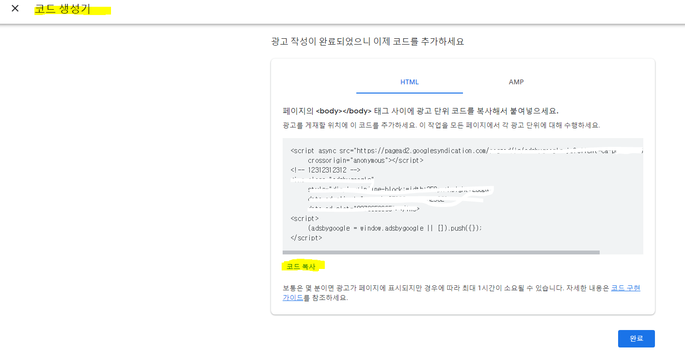 그러면 아래와 같은 화면으로 바뀌게 됩니다. 본인의 광고 코드가 생성이 된거에요....:)