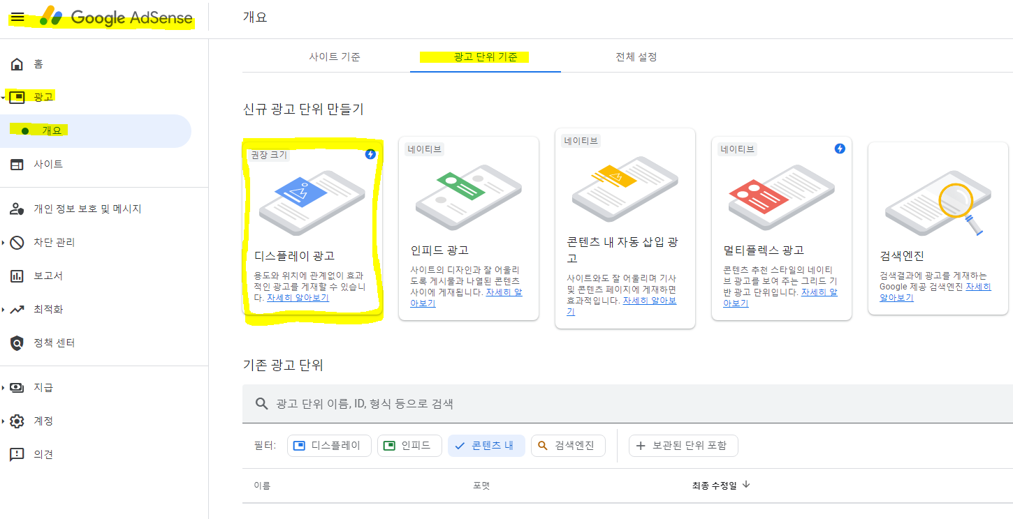 3) 애드센스 광고단위(디스플레이) 만들기