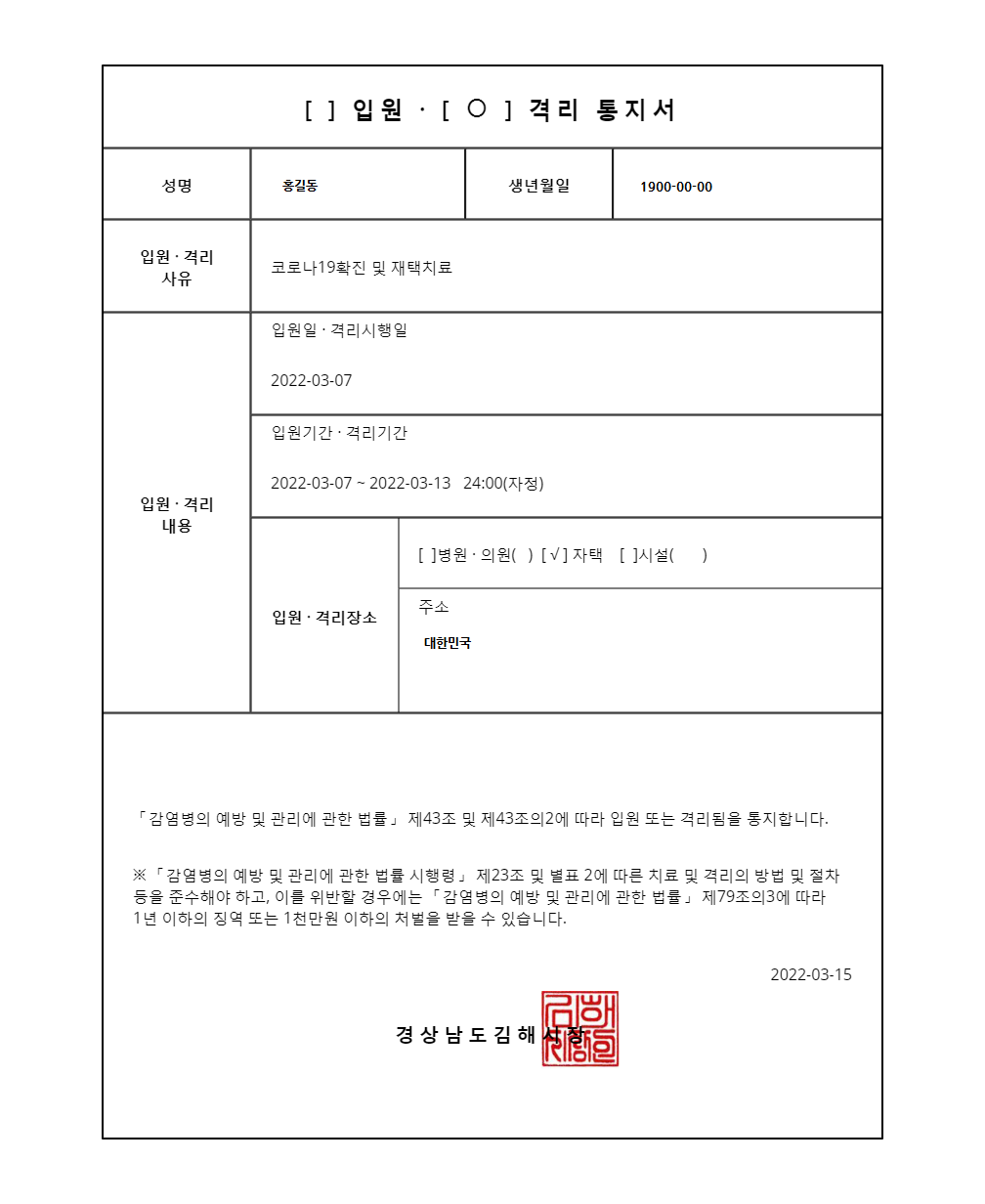 - 격리해제통지서는 별도 발급 되지 않으며 격리통지서로 갈음합니다.