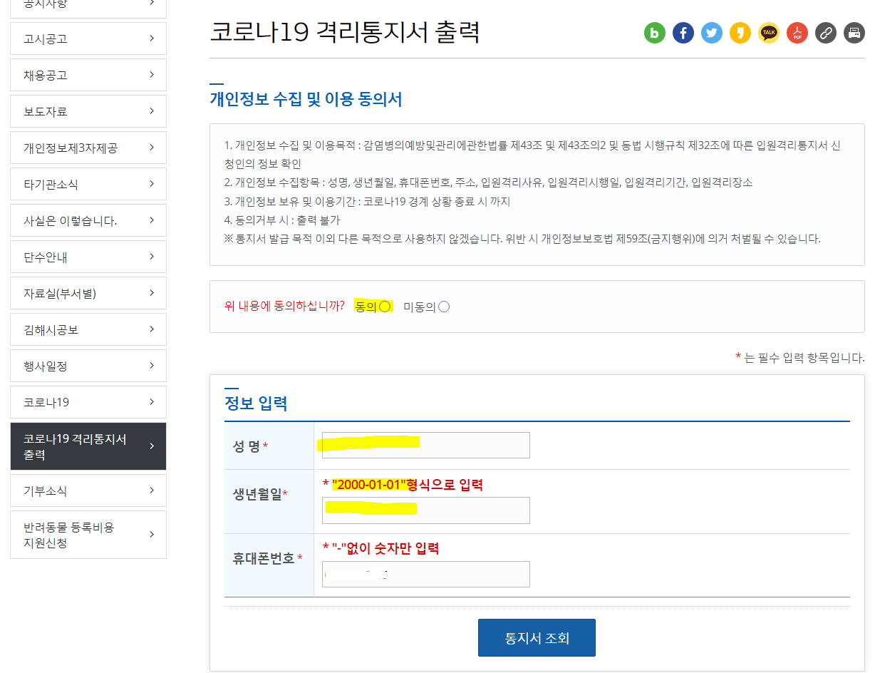 [정보] 코로나19 김해시 자가격리통지서, 자가격리확인서 온라인 출력방법!!