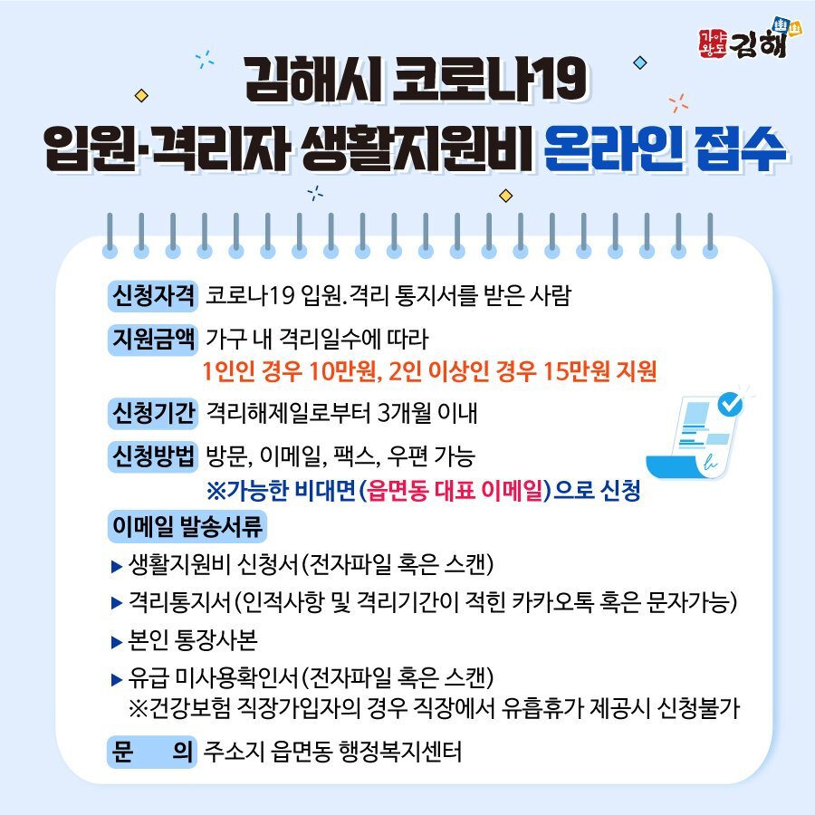 [정보] 김해시 확진자(자가격리자) 생활지원금 온라인 신청방법 / 담당자 메일 안내!!