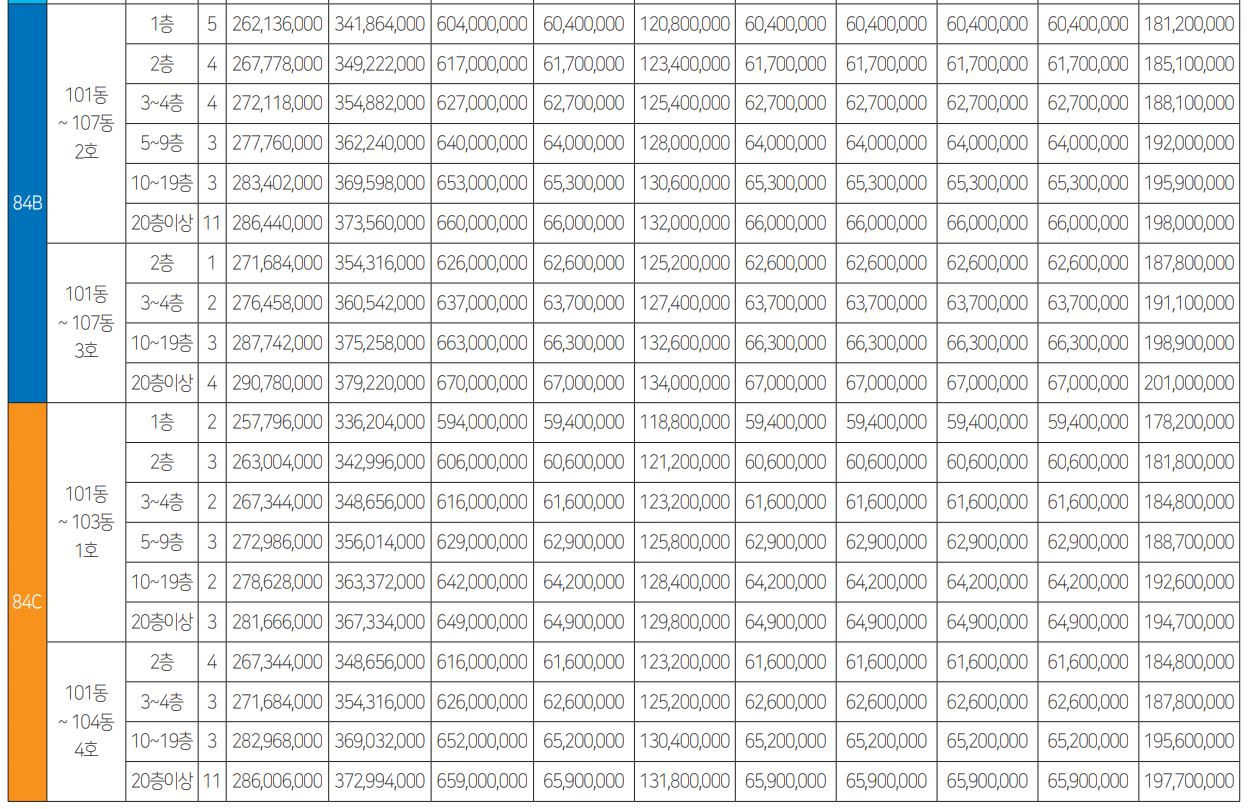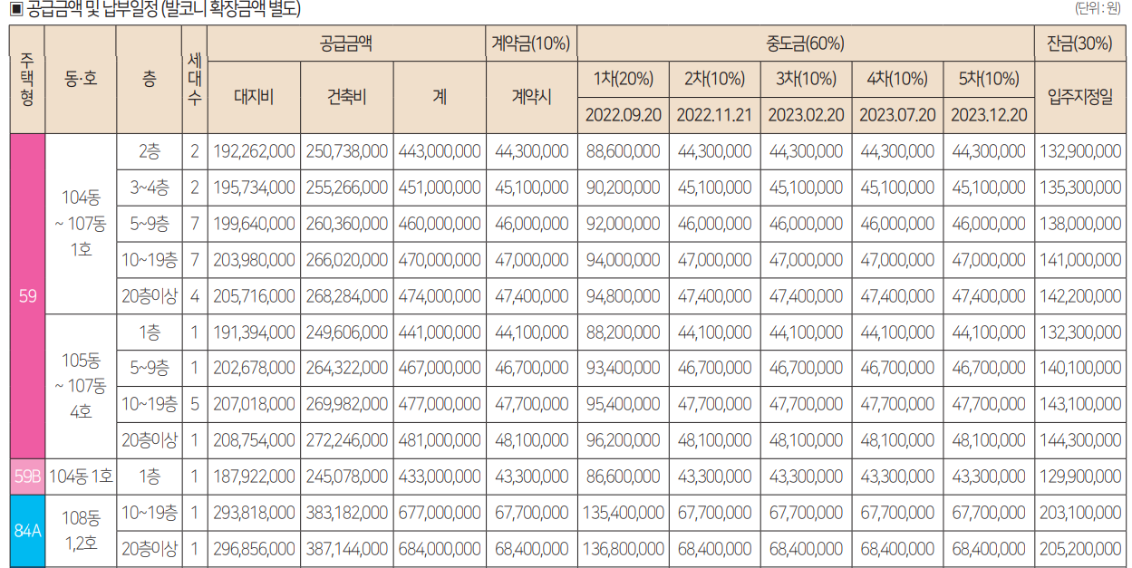 - 주택형 84 형은 최소 6.04억 ~ 최대 6.84억 (발코니 확장금액 별도)