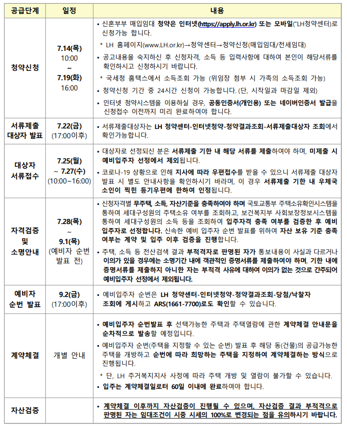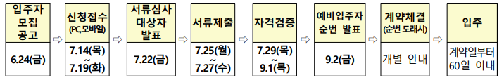 * 사회보장정보시스템(복지부 산하기관)을 활용한 소득 및 자산 조회 일정 지연, 소명대상자 발생 등의사유로 일부 주거복지지사에서는 예비자 순번 발표 및 이후 일정이 지연될 수 있습니다.