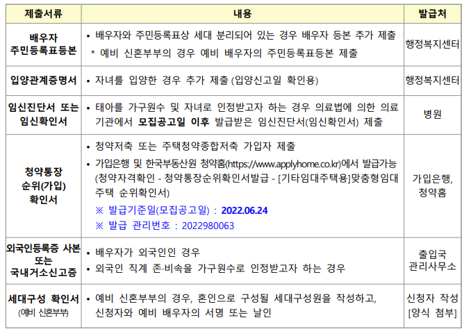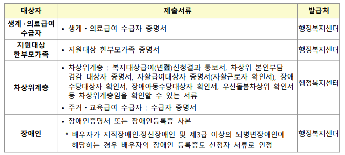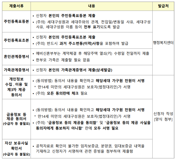 * 수급자, 지원대상 한부모가족(한부모가족 증명서), 차상위계층은 금융정보 등 제공 동의서, 자산 보유사실 확인서 제출 불필요(예비 신혼부부 제외)