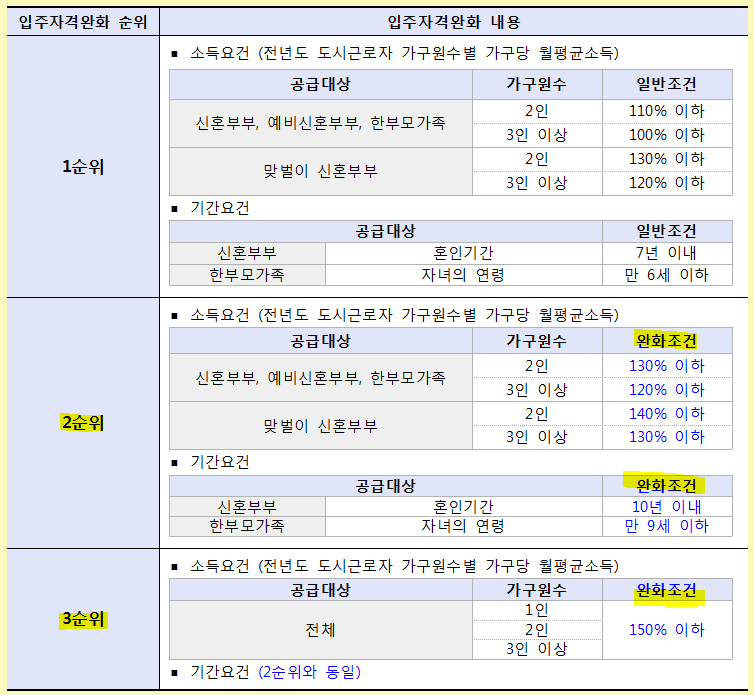 1순위는 입주자격완화가 없으며 2순위와 3순위 자격이 완화되었으니 아래 표를 참고하시기 바랍니다.