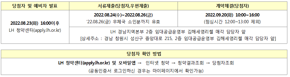 • 당첨자는 아래 당첨자 서류제출 기한 내에 관련서류를 제출하여야 하고 미제출 시 계약체결이 불가하며, 계약체결기간 내에 정당한 사유없이 계약체결하지 않을 경우 계약포기로 간주됩니다. (계약체결은 방문으로만 가능합니다.)