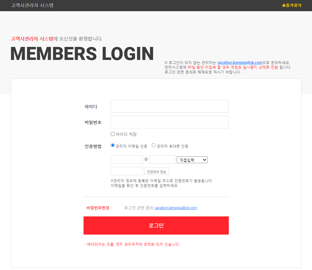 고객사관리자 시스템에 오신것을 환영합니다. ※ 로그인이 되지 않는 관리자는 vacation.benepia@sk.com으로 문의하세요. 관리시스템에 90일 동안 미접속 할 경우 계정은 일시중지 상태로 전환 됩니다.