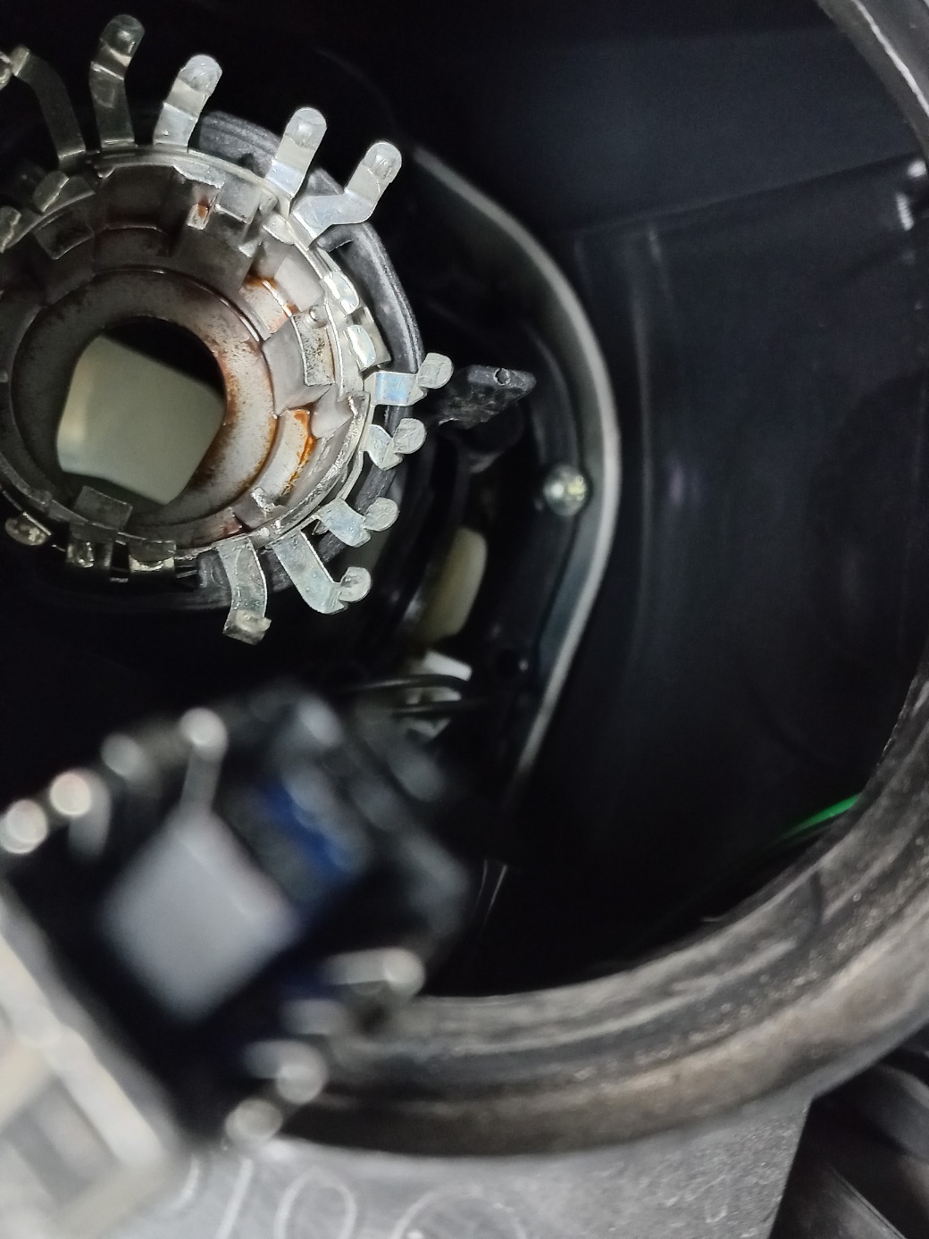 3) 이제 기존에 달려 있는 전구를 확인하고 뽑아 줍니다. 어떤 방식으로 꼳혀 있는가를 알아야지 감이 오는데 1차적으로 전구가 딱 고정이 되어 있어서 레바를 내려줘야해요.진짜 감으로 밖에 할 수가 없어요.... 오른쪽에 고리같은 플라스틱이 손에 잡히거든요? 그럼 그걸 위로 올리세요!!!!! 그럼 물려있던 전구가 밖으로 나와요. 아래 사진에 플라스틱 같은게 올라가 있는거 보이시죠? 이거에요!!!!!