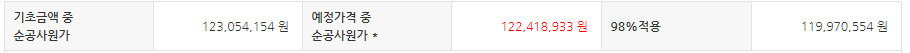122,418,933 x 0.98 = 119,970,554원 이 낙찰하한율로 결정 됩니다.